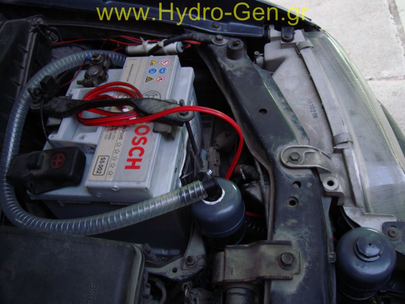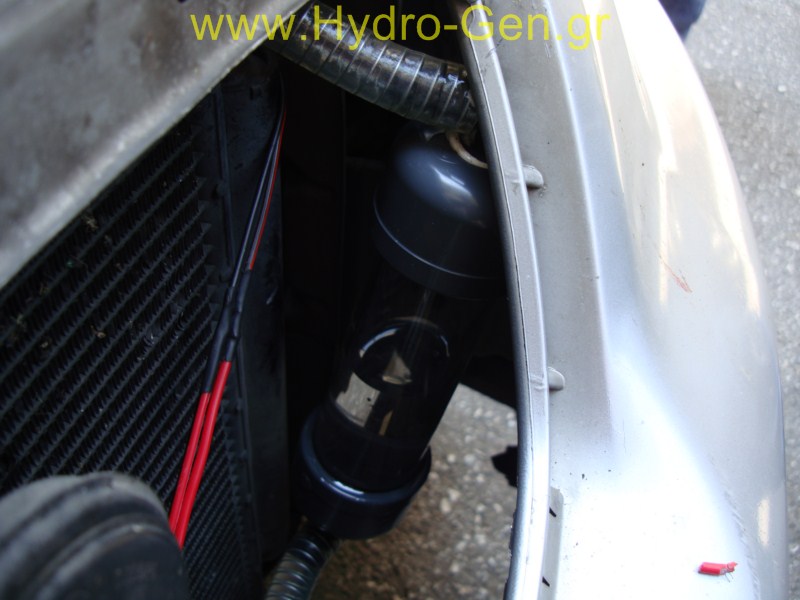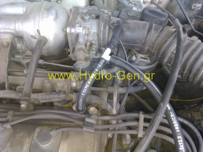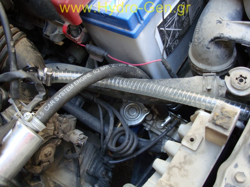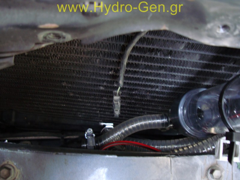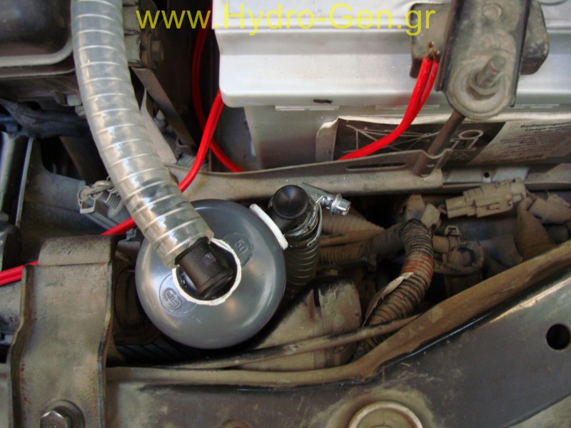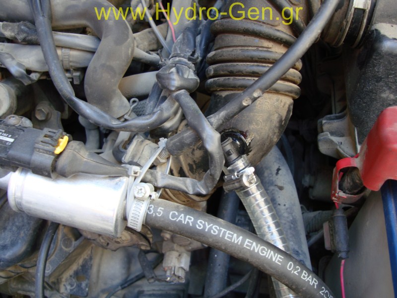 Στην εικόνα διακρίνεται ο λευκός σύνδεσμος (ταυ) που χρησιμοποιήθηκε για να συνδεθεί το σωληνάκι τροφοδοσίας του υδρογόνου με τον αεραγωγό του κινητήρα. Προτιμήθηκε η λύση να οδηγηθεί το υδρογόνο μέσω του σωλήνα αναθυμιάσεων του κινητήρα που απολήγει στον αεραγωγό, αποφεύγοντας μια νέα διάτρηση.
