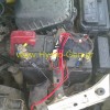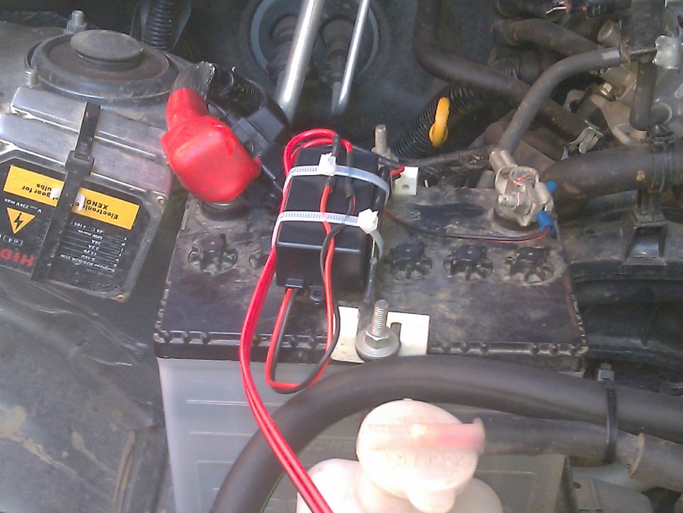 Διακρίνεται το τροφοδοτικό (μαύρο κουτί) στερεωμένο με δεματικά πάνω στην μπαταρία του Corolla.