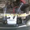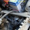 Τμήμα του κινητήρα στο οποίο είναι τοποθετημένη η μπαταρία του αυτοκινήτου. Στην μπάρα συγκράτησης της μπαταρίας στερεώσαμε το τροφοδοτικό με την βοήθεια δεματικών. Διακρίνεται η ασφαλειοθήκη προστασίας του τροφοδοτικού.